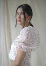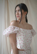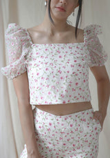 Two-way, puffed sleeved top made with printed organza and garterized sleeves, lined- can be worn sleeves up or off-shoulder