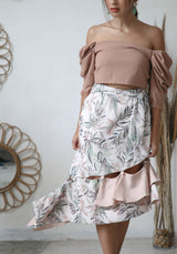 Limited ruffled skirt with tie, button and drape details made with printed chiffon and silk, fully lined