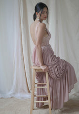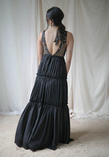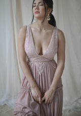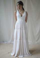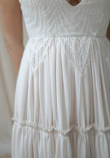 Full-length tiered gown with delicate lace detail made with french lace and silk blend, fully lined