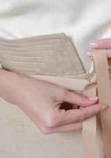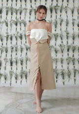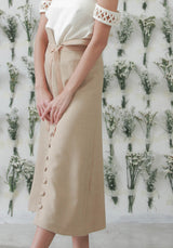 High waisted a-line midi skirt made from linen with signature ribbon, button and stitch details