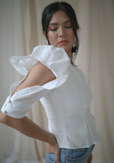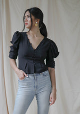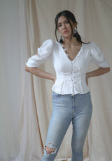 Button down, puffed and slit sleeved top made with textured cotton, lined