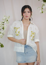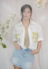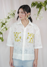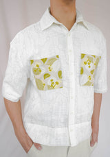 Unisex button down with hand-drawn and hand-printed bougainvillea flowers on linen pockets, made with cotton lace