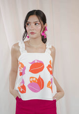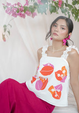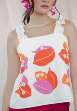Linen top with hand-drawn, hand-printed bougainvillea flowers and ruffled straps.