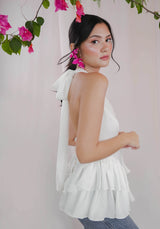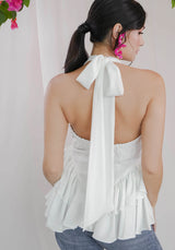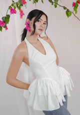 Halter top with a dropped ruffled waist and back button closure. Adjustable ties, fully lined. Our signature flattering silhouette for all body types.