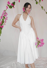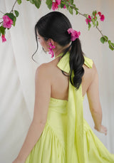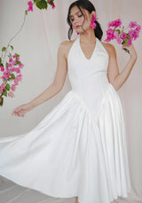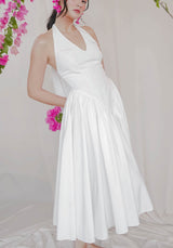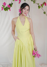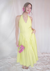 Halter dress with a dropped ruffled waist. Adjustable ties, fully lined + with pockets. Our signature flattering silhouette for all body types.